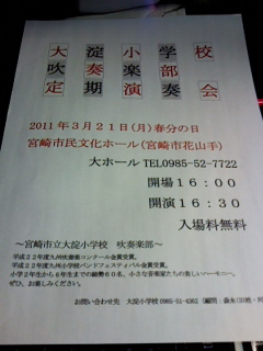 3月21日(祝)は宮崎市民文化ホールで大淀小学校吹奏楽部の定期演奏会ですよー。